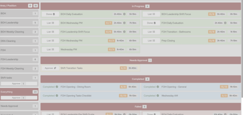 The Checklist Dashboardis your default home page. This page will hold your team accountable for tasks completion while providing a performance overview by area or position. Each report group is clickable allowing you to drill down for more details.