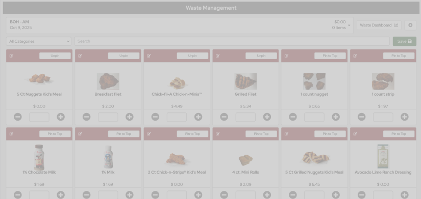 The Item screenis where you select each product that has been wasted to begin the report. The system will pull pricing in automatically.